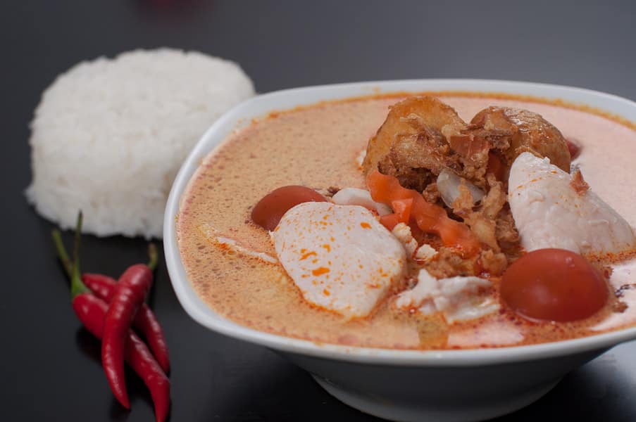Gul karry med kylling, tofu eller kun grøntsager sammen med kokosmælk, gulerødder, kartofler, tomater og løg. Toppet med ristede løg og serveret med ris.